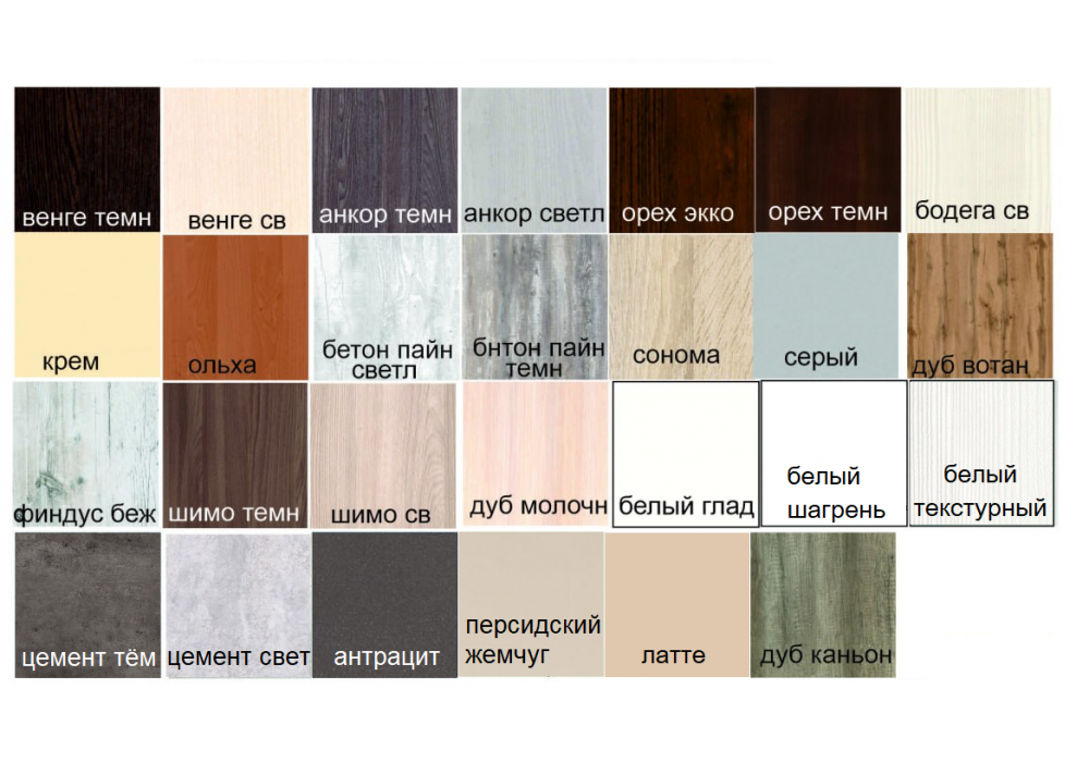 Стандартные цвета: белый , дуб сонома, ясень шимо тёмный, ясень шимо светлый, яблоня, орех лесной, ольха, бук, вишня, венге темный, орех темный,дуб молочный, светлый венге.